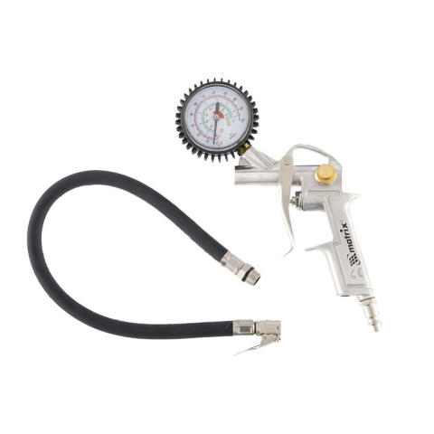 A MATRIX 573229 gumiabroncs-felfújópisztolyt gumiabroncsok felfújására használják az autószervizekben, valamint gumiabroncsokhoz. A modell fel van szerelve nyomásmérõvel, amely ellenõrzi a gumiabroncsok üzemi nyomását, valamint egy nyomáscsökkentõ szelep