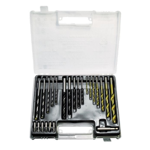 A kombinált készlet otthoni barkács használatra készült. A készlet tartalmazza a leggyakoribb bit- és fúróméreteket. Szénacél betonfúró keményfém betéttel, VK8 minõségû anyagból. Nagy sebességû acél (HSS) fúrók. Szénacél fafúró. Króm-vanádium acél bi
