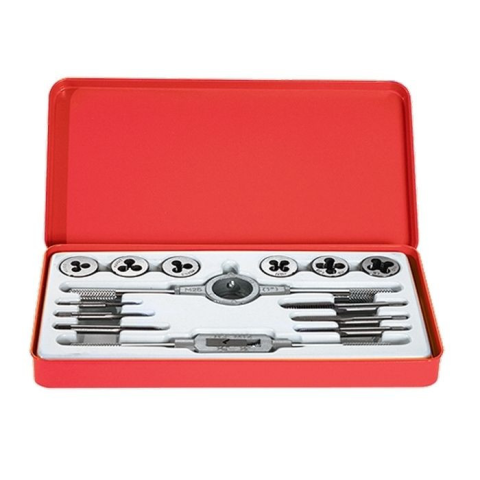 Csapok és vágófej készlet M3 - M10 méretben 14 db. Különbözõ átmérõjû, típusú és dõlésszögû belsõ és külsõ menetek vágására tervezték az átmenõ és vak furatokban. Alkalmas színesfémekhez és 800 N / mm2 szakítószilárdságú acélokhoz. A menetfúrók és matri