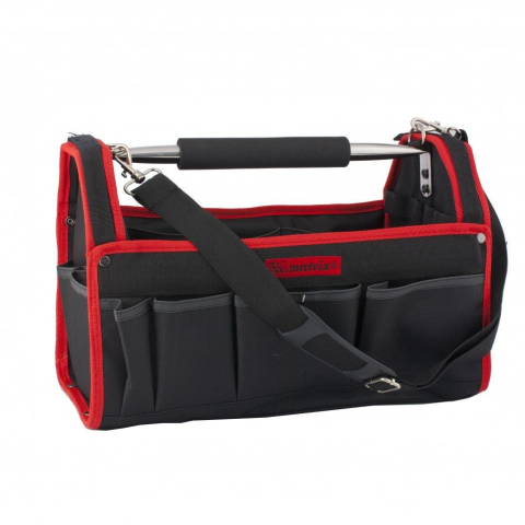 A hordozót kifejezetten a szerszám tárolására és szállítására tervezték. Tartós szintetikus anyagból, merev kerettel, polipropilénbõl készült öntött alsó részével. Fém fogantyú, állítható hordszíj. Különbözõ méretû zsebekkel van felszerelve, kívül és belü