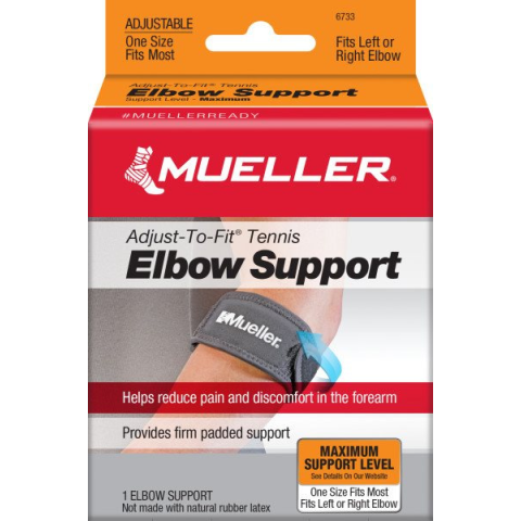 Ortézis könyökre - univerzális, anyaga poliészter és nejlon, uni méret A Mueller Adjust-to-Fit egy kifejezetten teniszkönyökhöz készült kiegészítő, amely különleges a gélbetétnek köszönhetően képes enyhíteni az alkar és a könyök fájdalmát. Ez nagy segítség lehet
