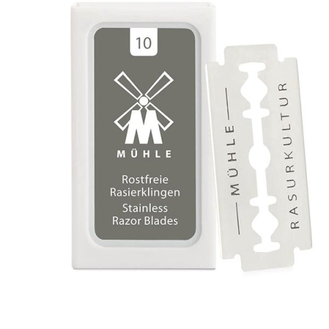 Borotvapengék - platina kivitelben, 10 db a csomagban A Mühle borotvapengék kiváló minőségű, platinabevonatú rozsdamentes acélból készültek a tökéletesen sima borotválkozásért. Minden penge külön viaszos papírba csomagolva. Papírdobozban szállítva, amely