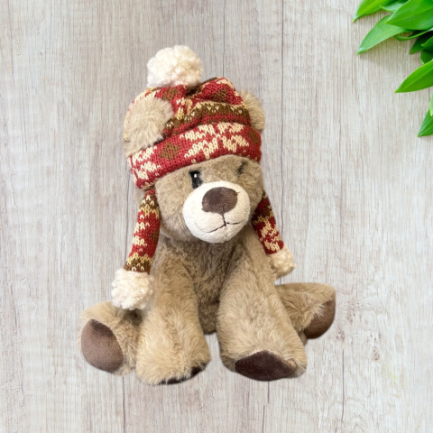 Puha mackó kötött sapiban. Méret:22cm Hibátlan állapotú.