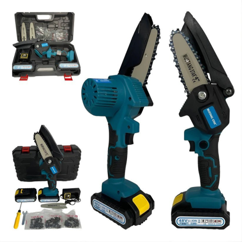 Mustang Star MTS-5019 akkumulátoros mini láncfűrész 48VTermék Jellemzői:Akkumulátor Típusa: Li-ion, tartós és gyorsan újratölthető.Lánc Hossza: 0,33 m, precíz és gyors vágást tesz lehetővé.Könnyű Kialakítás: Mindössze 4 kg alatti súly a könnyű kezelhetőségért.Előnyök:Antivibrációs Rendszer: Stabil kezelés és csökkentett vibráció.Ergonomikus Tervezés: Egykezes működtetés a könnyű használhatóságért.Praktikus és Sokoldalú: Ideális otthoni és sza