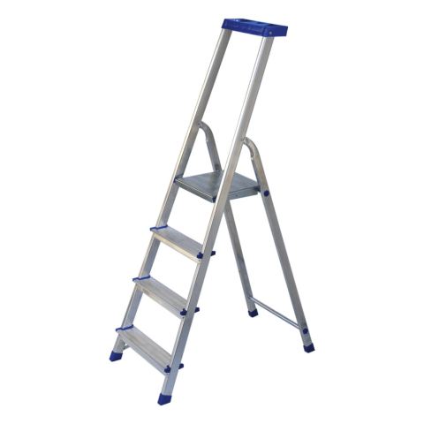 Alumínium egyoldalas létra, csúszásmentes lépcsővel. Az 5. lépcsőfokozattól rögzítő textil hevederrel van felszerelve, amely megakadályozza a létra további kinyilását.