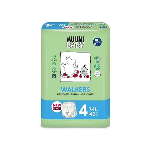Bugyipelenka - környezetbarát, eldobható, mérete 4, 7-11 kg súlyú gyermekek számára, hipoallergén, pelenkakiütés elleni védelem, extra légáteresztő, parfümmentes, klórmentes, anyaga cellulóz, felhúzható, állatkás motívum, 40 db a csomagban Eko Muumi Baby Pants Maxi are disposable organic diaper panties. They are 100% chlorine-free, contain no allergens or irritating fragrances or lotions. Diaper panties are developed in collaboration wi