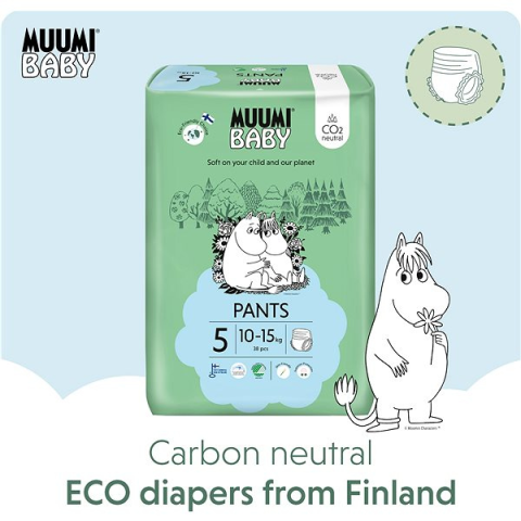 Bugyipelenka - környezetbarát, eldobható, mérete 5, 10-15 kg súlyú gyermekek számára, hipoallergén, pelenkakiütés elleni védelem, extra légáteresztő, parfümmentes, klórmentes, anyaga cellulóz, felhúzható, állatkás motívum, 114 db a csomagban Would you like your baby to wear nappy pants that are sensitive and gentle to skin while also not placing a burden on the environment? If so, the ideal solution is the eco-friendly Muumi Baby Walkers
