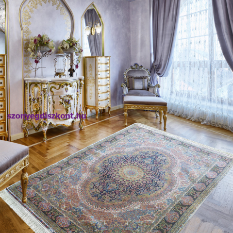 QUM klasszikus szőnyeg kék színárnyalatban, 160 x 230cm méretben. A 100% selyem alapanyagból készült darab puha tapintású, mégis strapabíró, ideális választás bármelyik helyiségbe. 5mm vastagságával kellemes járófelületet biztosít. A szőnyeg rendszeres po
