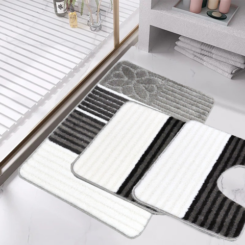Fürdőszobai szőnyeg szürke színben, 50 x 80cm + 2db x 40 x 50cm méretben. A 100 % Polypropylen anyagból készült darab kellemes járófelületet biztosít. A választott típus praktikus és dekoratív kiegészítő otthonába. A termék rendszeres porszívózással vagy