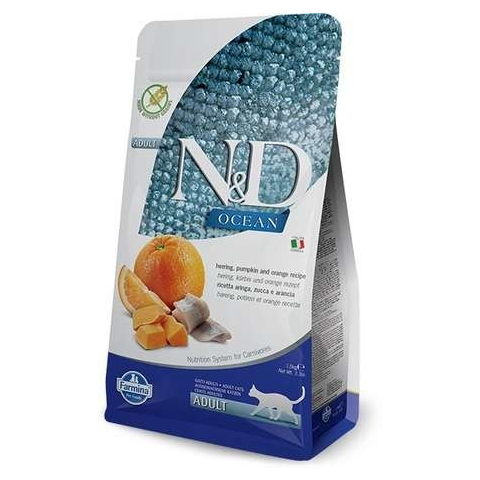 N&D Cat Ocean teljesértékű eledel felnőtt macskáknak friss, vadon kifogott heringgel, sütőtökkel és naranccsal. Gabona- és gluténmentes szuperprémium macskatáp.