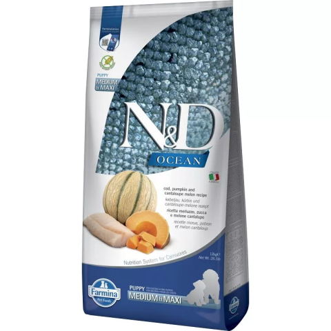 N&D Ocean Dog tőkehal,sütőtök&sárgadinnye Puppy medium/maxi 12kg kutyaeledel termékleírás