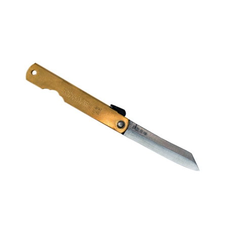 Nagao Higonokami - DB090Közepes méretű tradícionális japán zsebkés, amely annak ellenére, hogy nem rendelkezik zárral, több dologra képes, mint amit el tudunk képzelni. Kézi megmunkálással készül, markolata hajtogatott réz, melyet kanjis-sal (japán ír