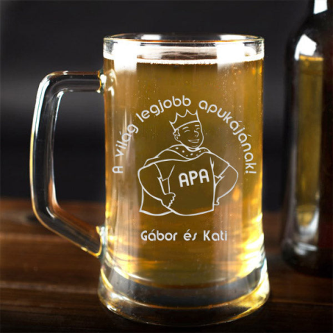 🍺 A világ legjobb apukájának – egyedi homokfúvott söröskorsó Ha egy igazán különleges és személyes ajándékot keresel Apák napjára, születésnapra vagy csak úgy szeretetből , ez a homokfúvott söröskorsó tökéletes választás! A "Világ legjobb apukájának" felirat mellé egyedi név vagy rövid üzenet is kerülhet, így minden korsó teljesen személyre szabott. A homokfúvott technológiának köszönhetően a minta nem kopik, nem fakul, és elegáns megjelen