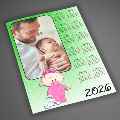 👶 2026-os fényképes A4-es naptár Tedd még különlegesebbé az új évet ezzel a babás, szeretetteljes hangulatú fényképes naptárral! Az A4-es méretű, egyoldalas 2026-os naptár vidám zöld háttérrel és cuki babafigurával készült, így tökéletes választás újdonsült szülőknek, nagyszülőknek vagy keresztelős ajándéknak. A bal oldalon található fotóhely szabadon cserélhető , így saját fényképed kerülhet rá – legyen az a kisbabádr
