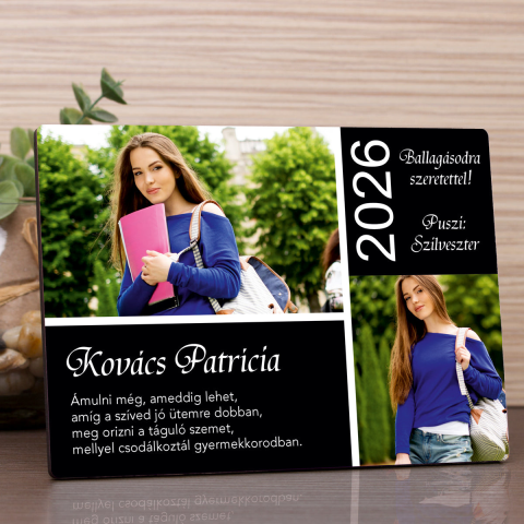 🎓 Egyedi fényképes ballagási fotópanel – személyes üzenettel A ballagás életünk egyik legmeghatóbb pillanata, amit érdemes örökre megőrizni. Ez az elegáns, fényes felületű ballagási fotópanel tökéletes ajándék lehet a ballagó diákoknak vagy az osztálytársaknak. A fényképek mellett a név, az idézet, az évszám és a személyes üzenet is szabadon megadható, így igazán egyedi és maradandó emlék készülhet. 🎁 Kombináld egyedi fényképes ballagá
