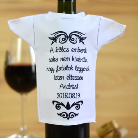 🍷 Egyedi borosüveg póló – elegáns kiegészítő minden alkalomra Egy üveg bor önmagában is remek ajándék, de egy személyes üzenettel ellátott borosüveg pólóval igazán emlékezetessé tehető! Tökéletes születésnapra, névnapra, évfordulóra vagy akár céges ajándéknak. Írd meg a saját jókívánságod, idézeted vagy humoros üzeneted, és mi megvalósítjuk neked. 📏 Jellemzők: Anyaga: fehér poliészter Illik 0,75 l-es boros- és pezsgősüvegre is