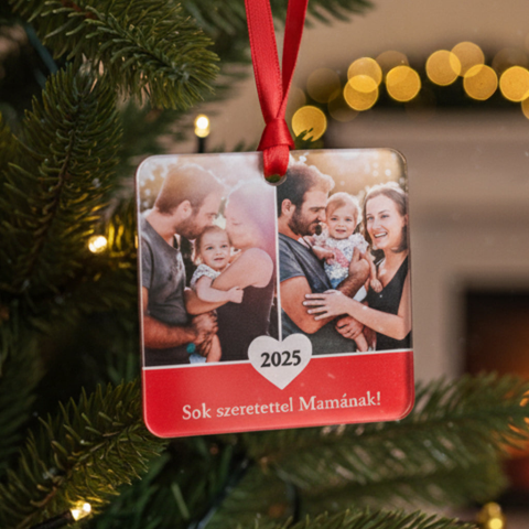 Egyedi fényképes karácsonyfadísz – szív-évszámos, két fotóval Ajándékozz különleges, személyre szabott emléket! Ez a négyzet alakú, akril karácsonyfadísz két kedvenc fotódat jeleníti meg, középen szív formában az aktuális évszámmal , alul pedig egy rövid, személyes üzenettel a piros sávban. Tartós, elegáns megoldás, amely évről évre mosolyt csal a fa alá. Főbb jellemzők Anyag: akril (hátoldalán emblémázott) Méret: 63 × 63 mm Sz