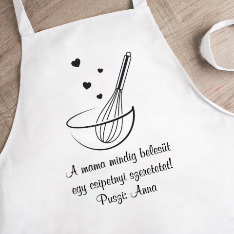 🍳 Egyedi feliratos kötény Minden családban van valaki, akinek a főztje felér egy öleléssel . Ez a személyre szabható kötény tökéletes ajándék a nagyinak, aki nemcsak finomat főz, hanem minden ételbe beletesz egy kis szeretetet is. A grafikán szereplő tál és habverő alá egy háromsoros egyedi szöveg is kérhető – így a kötény teljesen személyre szabható, legyen szó születésnapról, anyák napjáról vagy karácsonyról. T ermékadatok: Anyaga: