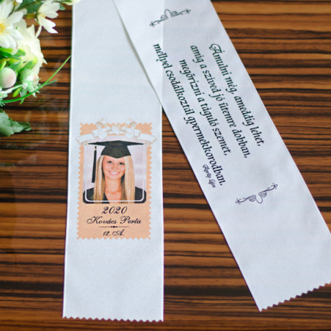 Szerete valami igazán egyedi szalagot a csokorra? Egy fényképes ballagási szalag kitűnő választás és örök emlék lehet minden diák számára. A szalag egyik oldalát a diák fényképe díszítheti, a másik oldalára pedig az Ön által választott idézet kerülhet. A fényképes ballagási szalag cikk-cakkban végződik, szélessége 7cm, hossza 150cm.