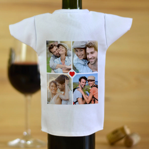 🍷 Fényképes borosüveg póló 4 képpel – romantikus és személyes ajándék Tedd különlegessé ajándékodat ezzel az egyedi borosüveg pólóval, amelyre négy kedvenc közös fotó kerül, középen egy szívecske motívummal. Tökéletes ajándék Valentin-napra, születésnapra vagy bármilyen alkalomra, amikor szeretnéd kifejezni az érzéseidet. 📏 Jellemzők: Anyaga: fehér poliészter Illik 0,75 l-es borosüvegre Négy fénykép elhelyezhető rajta 🎁 Tip