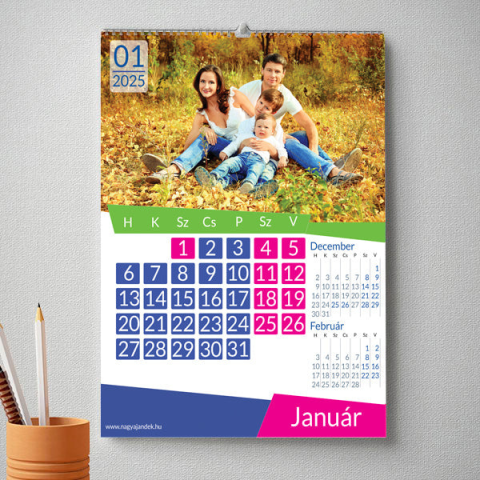 Fényképes falinaptár 2026 Tegye különlegessé az új évet egy vidám, személyre szabott fényképes falinaptárral , amely minden hónapban a legszebb pillanatokat idézi! A modern, kék-rózsaszín színes dizájn friss és fiatalos megjelenést ad, miközben a kedvenc fotókat praktikus, áttekinthető formában mutatja be. Tökéletes választás családoknak, pároknak, gyerekes szülőknek, nagyszülőknek vagy akár saját otthonába is – hiszen a naptár nemcsak ha