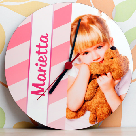 🕒 Egyedi fényképes falióra rózsaszín csíkos designnal Ez a bájos, rózsaszín csíkos mintájú fényképes falióra igazi ékessége lehet bármely gyerekszobának. Nem csupán az időt mutatja, hanem egy kedves, személyes fényképet és nevet is megjelenít, így minden pillantásra mosolyt csal a kicsik és nagyok arcára. 📏 Jellemzők: Átmérő: 20,5 cm Anyaga: fa, fényes felületű Egyedi fényképpel és névvel személyre szabható Tartalmazza az óraszerk