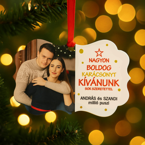 🎁 Egyedi fényképes fém karácsonyfadísz – személyes üzenettel Tegye felejthetetlenné az ünnepeket ezzel a különleges, egyedi fényképes karácsonyfadísszel , amelyen saját fotója és személyes jókívánsága is megjelenik. A grafikán a „Nagyon Boldog Karácsonyt Kívánunk Sok szeretettel” felirat szerepel, alatta pedig két sor szabadon szerkeszthető szöveg – így teljesen egyedivé teheti az ajándékot. A fényképes karácsonyfadísz kétoldalas, anyaga fém