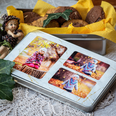 🍁 Egyedi fényképes fémdoboz három fotóval – Személyes ajándék saját képekkel Szeretnéd megőrizni a legszebb pillanatokat különleges formában? Ez az egyedi fényképes fémdoboz három fotóval tökéletes választás 🎁 – személyes, tartós és bármilyen alkalomra szívhez szóló ajándék. A doboz tetejére három kedvenc fotó kerül, így egyszerre több emléket is megörökíthetsz. Használható sütik, ékszerek, apró emlékek, varrós kellékek vagy ajánd