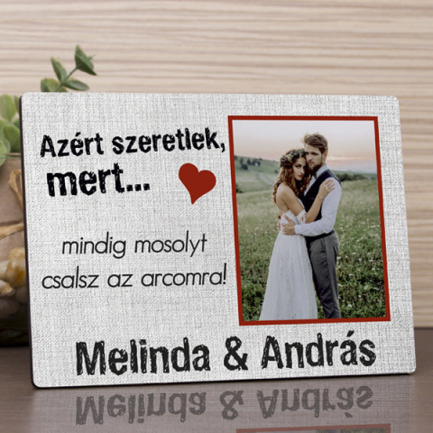 Néhány szóval kifejezhetjük érzéseinket a másik iránt, de ha ezekhez hozzá teszünk egy közös képet, akkor máris egy remek ajándékot varázsolhatunk kedvesünk számára Valentin napra, születésnapra vagy a közös évfordulóra. Az "Azért szeretlek, mert..." feliratot a grafika már tartalmazza, így azt újra megadni nem szükséges. A fényképes fotópanel anyaga fa, felülete fényes, mérete 17,7x13cm, vastagsága körülbelül 6mm. Különlegessége, hogy a képek és a