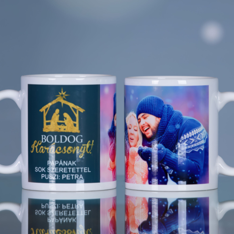 🎁 Egyedi fényképes karácsonyi bögre – szívből jövő ajándék a fa alá Tegye még különlegesebbé az ünnepeket egy személyre szabott karácsonyi bögrével! A klasszikus Betlehem-motívum és a „Boldog Karácsonyt!” felirat ünnepi hangulatot teremt, a kedvenc fényképpel és rövid személyes üzenettel kiegészítve pedig igazán meghitt és egyedi ajándék lesz belőle. A bögre 3 dl-es , mikrózható és mosogatógépben is mosható. A „Boldog Karácsonyt!” f