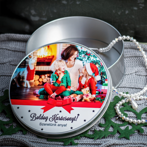 🎄 Fényképes karácsonyi fémdoboz – Egyedi ajándék saját fotóval Szeretnél igazán személyes ajándékot adni az ünnepekre? Ezzel az egyedi fényképes karácsonyi fémdobozzal nemcsak ajándékot adsz, hanem meghitt emléket is. A doboz tetejére saját családi, páros vagy gyerekfotó kerülhet, alá pedig személyes üzenet, például „Szeretünk anya!” vagy „Tőled szebb az ünnep!” . A fényes nyomtatott fedél ünnepi hangulatot áraszt, a Boldog Karácsony fel