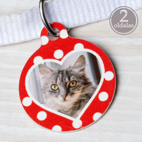 🐾 Kétoldalas fém macskabiléta – piros-fehér szíves design Tegye kedvencét biztonságossá és stílusossá ezzel az egyedi, szív alakú mintás bilétával! Ez a kétoldalas, kör alakú fém macskabiléta egyik oldalán helyet kap kedvence fotója, míg a másik oldalon a név és a telefonszám szerepel – így, ha cicája elkóborol, könnyen visszajuthat Önhöz. ✨ Termékadatok: Anyaga: fém Szín/minta: piros-fehér pöttyös, szív alakú keret Átmérő: 3 cm