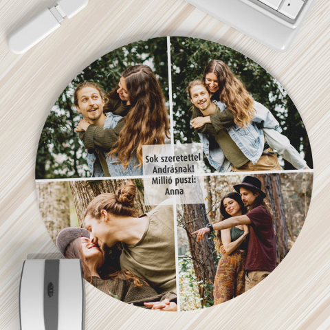 🖱️ Kör alakú fényképes egérpad – 4 képpel és személyes üzenettel Tökéletes ajándék, ha valami igazán egyedit keresel! Ez a kör alakú fényképes egérpad négy kedvenc fotóddal és egy rövid, négysoros üzenettel díszíthető, így egyszerre lesz megható és praktikus meglepetés. Ideális választás születésnapra, névnapra, évfordulóra vagy karácsonyra is. Termékjellemzők: Kör alakú kialakítás (átmérő: 20 cm) 4 fénykép + rövid szöveg e