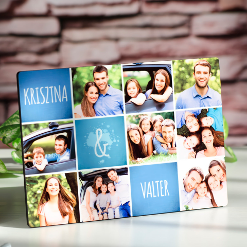 💙 Egyedi fényképes fotópanel – 9 képes elrendezés Stílusos, modern és tele emlékekkel! Ez a 9 képes fényképes fotópanel tökéletes választás azoknak, akik szeretnék egy helyen megőrizni kedvenc pillanataikat. A képek mellé elhelyezett nevek és grafikai elemek személyessé és meghatóvá teszik az ajándékot – legyen szó családról, párról vagy barátokról. 🎁 Kiváló ajándék évfordulóra, születésnapra, karácsonyra vagy bármilyen különleges alka