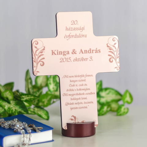 💞 Egyedi fa kereszt házassági évfordulóra – meghitt, személyes ajándék Egy házassági évforduló mindig különleges pillanat: az összetartozás, a szeretet és a hűség ünnepe. Ez az egyedi, névre szóló fa kereszt gyönyörű emléktárgy, amely méltón szimbolizálja a közös életút értékeit és a házasság szentségét. A kereszten feltüntethető a házaspár neve, a dátum és egy rövid idézet vagy üzenet, így teljesen személyre szabható ajándék ké
