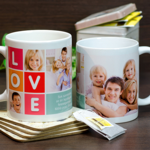 ❤️ LOVE fényképes bögre – egy csésze szeretet minden napra Egy bögre, ami minden kortynál emlékeztet arra, mennyire fontos a szeretet! Ez a „LOVE” feliratú fényképes bögre nemcsak különleges dizájnjával, hanem személyre szabható megjelenésével is elvarázsol. A színes betűk mellett négy kedvenc fotó is elhelyezhető rajta, valamint egy rövid, személyes üzenet is, amely még meghittebbé teszi az ajándékot. Tökéletes választás Valentin-napra, évfor