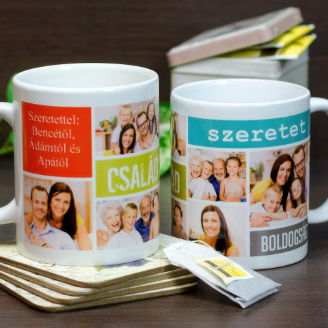 Fényképes családi bögre – 6 fotóval és személyes üzenettel A család, a szeretet és a közös pillanatok teszik igazán széppé az életet – és most mindezt egyedi formában meg is örökítheted! Ez a különleges fényképes bögre 6 kedvenc családi fotó elhelyezésére ad lehetőséget, mellé pedig egy rövid, személyes üzenet is megadható – például: „Szeretettel: Bencétől, Ádámtól és Apától” . A modern, színes grafika „ Család – Szeretet – Bol