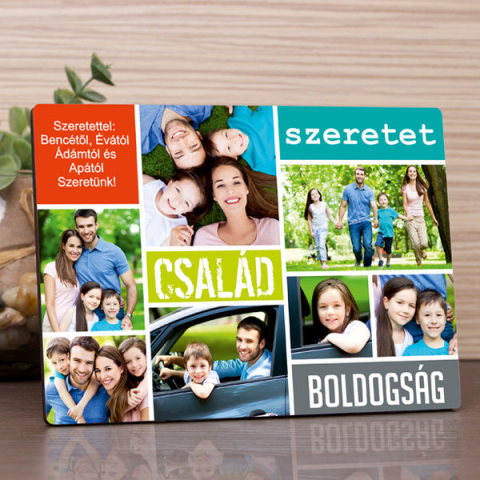 🏡 Egyedi fényképes családi fotópanel – „Család, szeretet, boldogság” A legszebb pillanatok akkor születnek, amikor együtt a család – és most ezeket a pillanatokat meg is örökítheted ezen a különleges, egyedi fényképes fotópanelen . Válassz ki 7 kedvenc családi fotót , és egészítsd ki egy rövid, személyes üzenettel, hogy igazán egyedi ajándék váljon belőle. A „ Család – Szeretet – Boldogság ” feliratok meleg, pozitív hangulatot árasztanak,