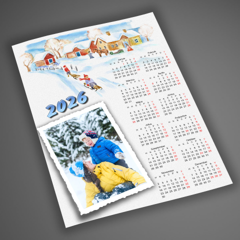 ❄️ 2026-os fényképes A4-es naptár Hozd vissza a tél legszebb pillanatait ezzel a hangulatos, szánkózós mintájú fényképes naptárral! Az A4-es méretű, egyoldalas 2026-os naptár vidám, havas tájat ábrázol, ahol a gyerekek önfeledten szánkóznak – tökéletes választás családoknak, akik szeretik a téli emlékeket. Az évszám alatti fotóhely szabadon cserélhető , így a saját kedvenc fényképed kerülhet a naptárra – akár egy családi sí