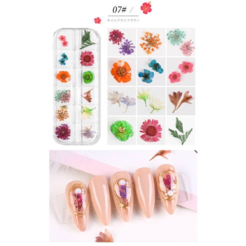 Szárított körömdíszítő virágok dobozban. Kiváló kellék műkörömépítéshez, körömdíszítéshez.