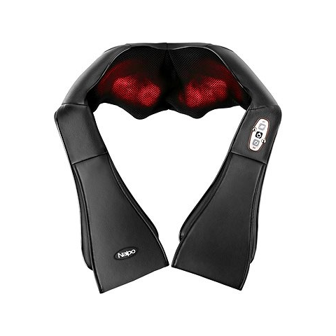 Nyak- és vállmasszírozó - egész test masszírozására, célja relaxáció, fájdalomcsillapítás, shiatsu masszázs, 3 intenzitási szint, 1 programmal, automatikus kikapcsolási lehetőség, intenzitás beállítási lehetőség, kétirányú forgás, ergonomikus forma, úti kialakítás, légáteresztő anyag, töltő is a csomag része, hálózati tápellátás, szivargyújtóról működtethető, fekete színben, tömege 1600 g, mérete 15,6 × 14 × 109 cm (Ma×Sz×H) A Naipo MGS-150