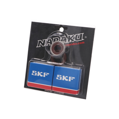 A Minarelli AM motorral rendelkező sebességváltós robogókhoz alkalmas hajtókar csapágyakat tartalmazó szett. A Naraku SKF hajtókar csapágy szett minőségi SKF csapágyakkal van felszerelve, és kiváló minőségű pótalkatrészként szolgál a magas sebességű verse