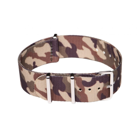 NATO óraszíj Ajánlott búvár (diver), katonai (military) és sportos stílusú karórához. Klasszikus viselet! Szín: barna/zöld terepmintás Anyaga: nylon textil, fényes acél csatt Szélessége: 22 mm Hossz: 270 mm Vastagság: 1 mm Használja letölthető méretezési