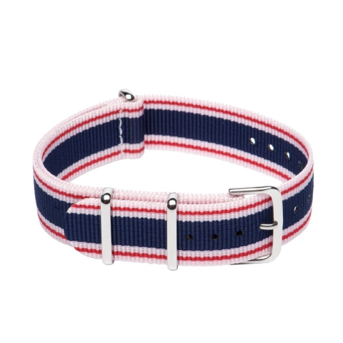 NATO óraszíj Ajánlott búvár (diver), katonai (military) és sportos stílusú karórához. Klasszikus viselet! Szín: sötétkék/fehér/piros Anyaga: nylon textil, fényes acél csatt Szélessége: 20 mm Hossz: 270 mm Vastagság: 1 mm Használja letölthető méretezési se