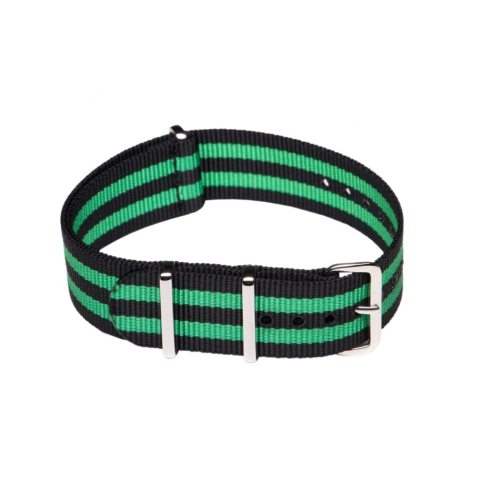 NATO óraszíj Ajánlott búvár (diver), katonai (military) és sportos stílusú karórához. Klasszikus viselet! Szín: fekete/zöld Anyaga: nylon textil, fényes acél csatt Szélessége: 20 mm Hossz: 270 mm Vastagság: 1 mm Használja letölthető méretezési segédletünk