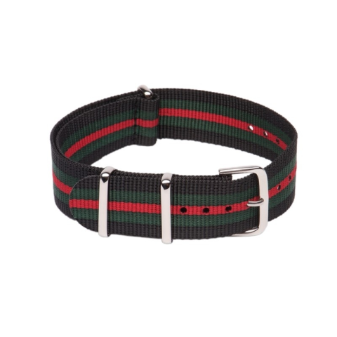 NATO óraszíj - James Bond stílusú Ajánlott búvár (diver), katonai (military) és sportos stílusú karórához. Klasszikus viselet! Szín: feketepiroszöld Anyaga: nylon textil, fényes acél csatt Szélessége: 20 mm Hossza: 270 mm Vastagság: 1 mm