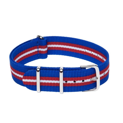 NATO óraszíj Ajánlott búvár (diver), katonai (military) és sportos stílusú karórához. Klasszikus viselet! Szín: kék/piros/fehér Anyaga: nylon textil, fényes acél csatt Szélessége: 20 mm Hossz: 270 mm Vastagság: 1 mm Használja letölthető méretezési segédle