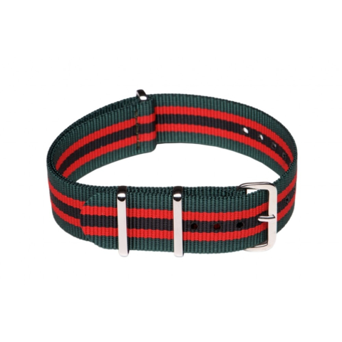 NATO óraszíj Ajánlott búvár (diver), katonai (military) és sportos stílusú karórához. Klasszikus viselet! Szín: zöld/piros/fekete Anyaga: nylon textil, fényes acél csatt Szélessége: 20 mm Hossz: 270 mm Vastagság: 1 mm Használja letölthető méretezési segéd
