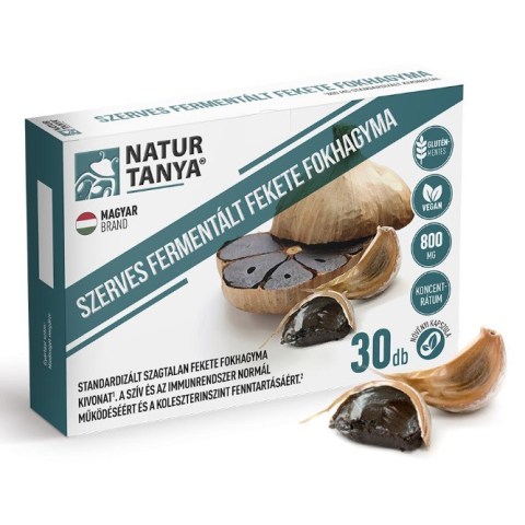 Natur Tanya® Fermentált Fekete Fokhagyma 800 mg - szagtalan, standardizált S-allil-cisztein.A szív és az immunrendszer normál működéséért és a koleszterinszint fenntartásáért. 800mg, standardizált fekete fokhagyma kivonat, növényi kapszulatokban, szagt