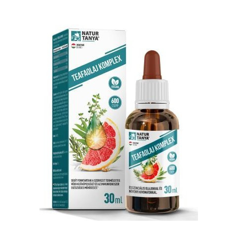 A Natur Tanya® TEAFAOLAJ KOMPLEX 5 féle növényi összetevőt koncentrál folyékony, csepp formában. Az összetevők között találunk standardizált esszenciális olajokat, mint az ausztrál teafa olaj (terpinénekkel) és a kerti kakukkfű olaj (timol, para-cimén és